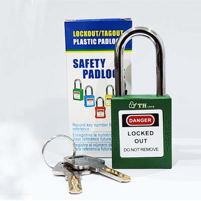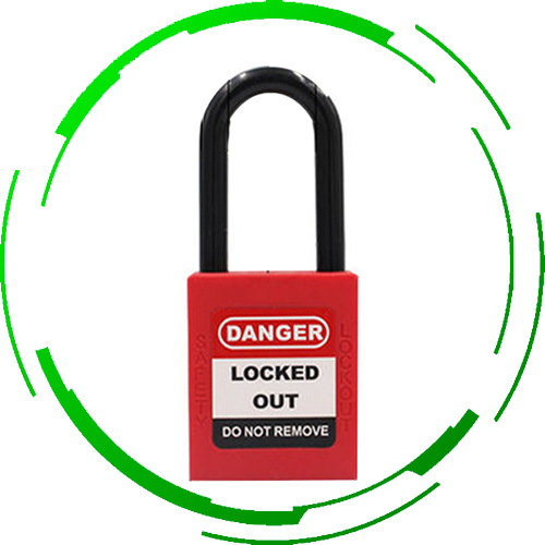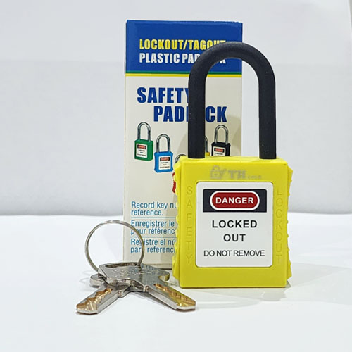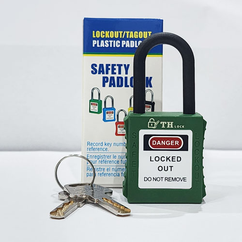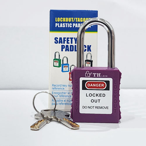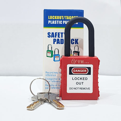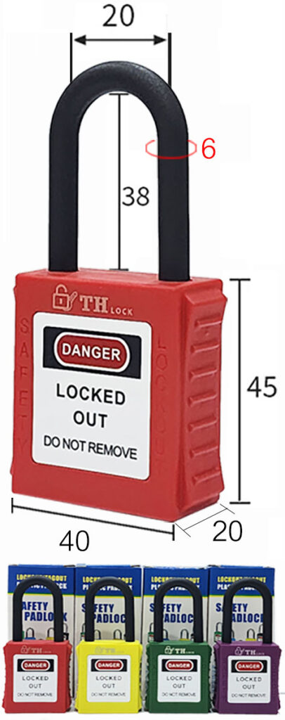 กุญแจนิรภัยก้านไนลอน Lockout safety padlock Nylon shackle ขนาด 38 มม. หรือ 1.5 นิ้ว ตัวก้านกุญแจเส้นผ่าศูนย์กลางขนาด 6 มม. ตัวกุญแจ และก้านกุญแจทำจากไนลอน มีความยืดหยุ่น ไม่แตกหักง่าย ไม่นำกระแสไฟฟ้า กุญแจมาพร้อมลูกกุญแจ 2 ดอก