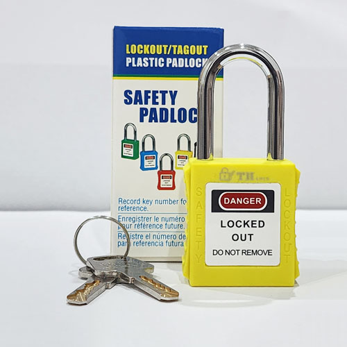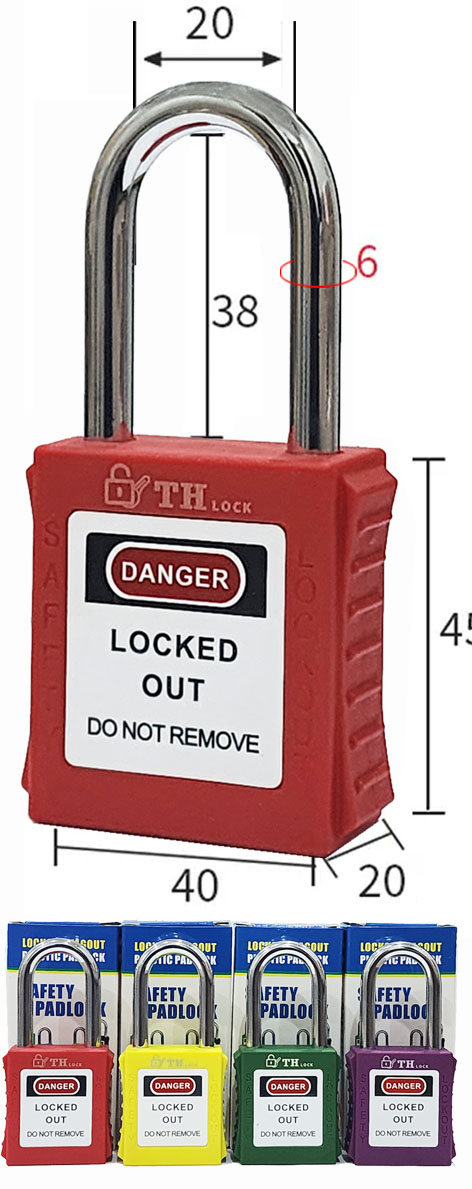 กุญแจนิรภัยก้านเหล็ก Lockout safety padlock Steel shackle ขนาด 38 มม. หรือ 1.5 นิ้ว ตัวก้านกุญแจเส้นผ่าศูนย์กลางขนาด 6 มม. ทำจากเหล็ก แข็งแรง ทนทาน ไม่แตกหักง่าย ตัวกุญแจผลิตจากไนลอน ยืดหยุ่น ไม่นำกระแสไฟฟ้า กุญแจมาพร้อมลูกกุญแจ 2 ดอก
